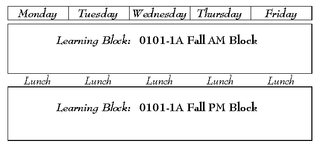 Several LEAs running Alternative Education programs have asked how they might utilize STUREC© to create "Block Schedules" or Non-standard style student schedules. A new trend seems to be emerging among Alternative educators as relates to student schedules. In a nutshell, many of you would like to get away from the traditional style of 5 to 8 classes scheduled sequentially for the same amount of time throughout the day and week and move to a schedule that groups fewer classes per day, but spreads them throughout the week. For example, a traditional schedule might look like this...