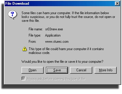 Always Save the file, never request to Open this file. You will see a Save As... dialog box. Remember where your installation of STUREC is located.
