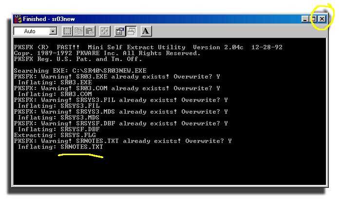 You will see a "DOS Box" if you are installing the Sr03 version for DOS. Answer Yes every time you are asked permission to Overwrite. When you see SRNOTES.TXT you are finished. Click the X in the upper corner to close.