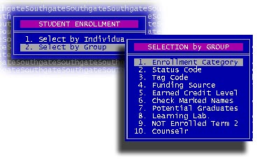 The 2.Select by Group option presents you with another menu where you may make a number of selections to narrow your search for a group of students with similar attributes. Once you make your selections to narrow your group, the records will be presented to you one at a time. You may enter or edit any data for a student then press PageDown to advance to the next record.