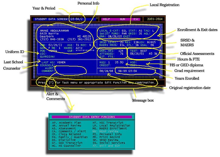 Everything that the database knows about a student may be accessed and verified from this screen using the Task menu. Press the letter T to pop-up the Task Menu. The options may be accessed by using the arrows to move the highlight then press Enter or simply type the two letter combination. Hint: the Hot Keys are the two letters in uppercase in the title of the option. Here is a review of each item on the Task menu. Items are in alphabetical order.