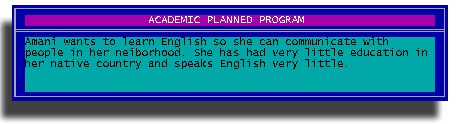 This is a requirement for adult students who must be reported via MAERS. Right now this is a narrative of background and goals for the ABE or ESL student. For adult HS completion students, the graduation requirements suffice as their Planned Program and for GED students, passage of the five components of the test battery is the plan. The Academic Plan is only revealed when you visit the option, otherwise there is no evidence of the plan on the student data screen. The folks in Lansing are working on "revising" the plan and renaming it Adult Learner Plan.