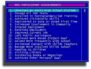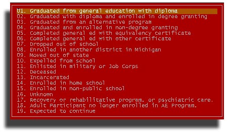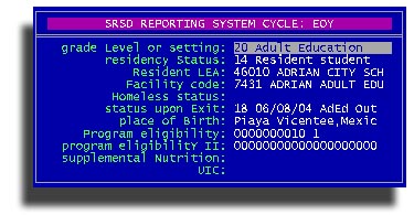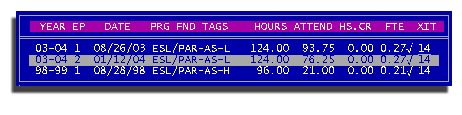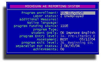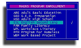 Anyway, you will be asked to declare the program from this list then you will be asked for the effective Enrollment Date. The enrollment date is the date the student signed the enrollment form. There can only be one program / enrollment date combination in a year. For example, a student could be enrolled in ABE on September 9th then enroll in GED on March 3rd the same year. Of course the ABE enrollment would have to be "closed" with a separation or end of year status code and date. This is very important because the Mystical Magical MAERS system uses the enrollment date as part of its "key" and therefore once entered can not be changed! After entering the date you will be asked to verify creation of new program enrollment. Look at it. If it is not correct, press the Escape key and do it again.