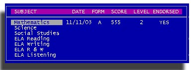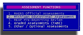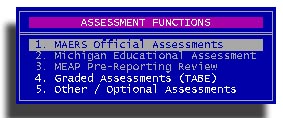 Notice that some items on the sub-menu may be 'grayed out' that means that that option is not available or not appropriate for the current student. In this example, we have an ESL student in focus and only youngsters (under 20) are eligible for the MEAP tests, therefore the MEAP related functions are grayed out.. In sub-menus with numbers, you may press the number of the item or use the arrows to move the highlight then press Enter to access a function or operation.