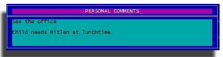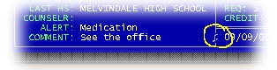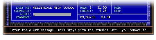 Notice the message in the message box at the bottom of the screen You may enter any keywords or phrase that may be important for you to be able to see immediately upon retrieving the student record. Enter only the minimal words to express your idea because this will show to anyone who views this screen. The full text of the message will be viewable when you press Enter. You may want to be careful how you word your comments and the spacing.