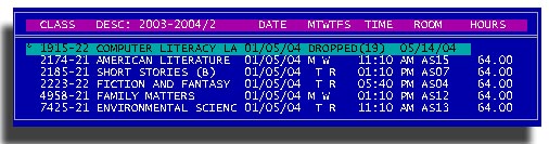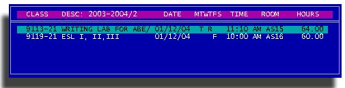 This option will bring up a list of the student's registered classes for the selected enrollment period. An adult ABE or ESL student may have a schedule similar to this.