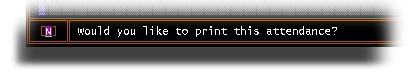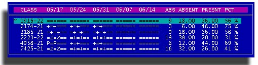 Use the arrows to move the pointer then press the Enter key to enter edit mode. You may change anything you like, it's your data. You may use the Control-LeftArrow and the Control-RightArrow to cycle left and right through the calendar. There is a lot of information here. The class code and name, the number of times absent, the number of hours absent, the number of hours present and the percentage of present. Equal signs in the display represent days the student is not scheduled. Plus signs represent days the class is scheduled, but the attendance has not been recorded. The letter "P" indicates that the student was present for the full scheduled class time. An integer number indicates the hours present less than the fully scheduled time. The letter "A" represents an unexcused absent as does the number zero. The letter "Z" is a generic excused absence, the letter "T" means the student was tardy. Other letters of the alphabet may be associated with various excused absence reasons. You may set these up as may be appropriate locally. See Menu:7.3.3.6. Absence Codes. When you press the Escape key to leave this attendance display, you will be asked if you would like to print this attendance.