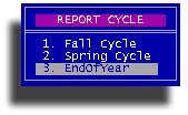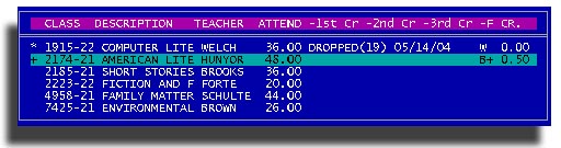 Also you can select any year / period combination and STUREC(c) will focus that for display of classes, attendance and grades for that and any other data that is tied to a specific year and or enrollment period. To select an enrollment period, use the arrows to move the pointer then press Enter.