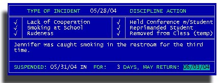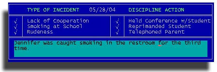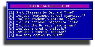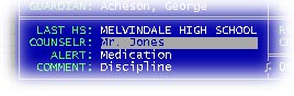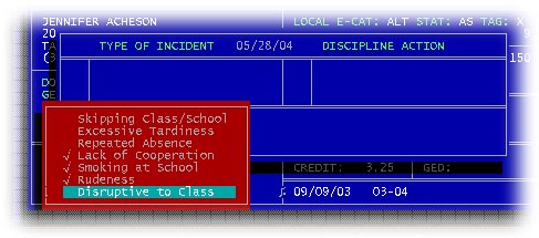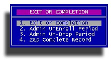 Now you can visit the various items that pertain to this student. The items on this panel may be accessed by moving the highlight an then press Enter or you may simply press the appropriate "Hot" key. The Hot keys are the ones Capitalized.