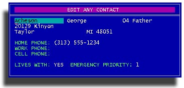 You may enter any contacts for this student and identify the relationship. STUREC(c) will search both the student and contact databases for a match to help prevent duplicates. Just follow the instructions in the message box. A list of all contacts and relationships will be maintained for each student. The primary contact name will be placed on the student screen next to the Guardian label. This would normally only be used with youngsters, but is available for all students.