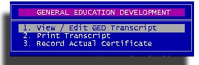 You enter the Date, form code and score for each test. Optionally you may enter a Percentile Rank and a local book code. STUREC(c) will dynamically maintain the total score and average. It will also indicate if the battery is Incomplete, Passes or Failed. You must enter the OSS number and Certificate Date. You may change the screen display order of the test components for your convenience. See this document. In order to properly report progress on GED students, you should maintain this data in a timely manner. If you don't want to record the individual test components, you may simply use option 3 on the sub-menu to record the actual certificate number and date. When you enter a GED Certificate date, STUREC(c) automatically records this in the Achievement portion of the MAERS record and the SRSD record. You may enter the OSSID number before the student earns the certificate.