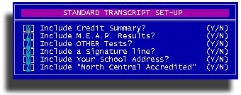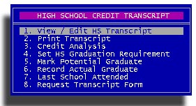 Before you even think about any of these options, you must set the student's HS Graduation Requirement. You may create up to 36 different sets of graduation requirements. See Menu:5.7.Graduation Requirements to establish sets of requirements for your school.