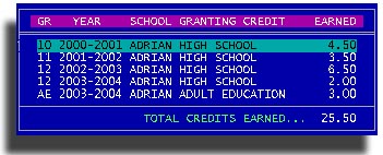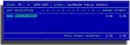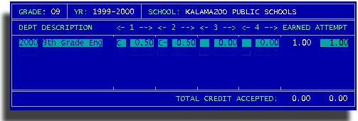 Enter the Grade Level of the credit you are about to enter. Your choices are 9, 10, 11 or 12, or HS for generic High School level and AE meaning either Alternative Ed or Adult Ed. Next enter the school year the credit was earned and finally the name of the school from whom you are accepting credit. This example shows grade level 9 in 1999-2000 school year from Kalamazoo Public.