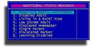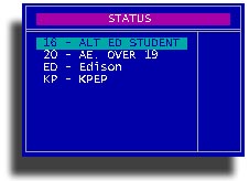 Next is the local Status code. This is a way to mark the student as a member of a group of similar students. Again, you may type the code, press question mark or leave blank to see the validation list. You create the validation list as may be appropriate for your district. See Menu:7.3.3.1.Status Codes