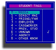The same procedure for student Tags. Each student record must have at least one Tag, but you may have up to three. Some districts use tags to track their advertising effectiveness, or whether the student is New or Returning, or maybe an academic sub-program such as Cosmetology or Nurses Aid or Teen Parent. See Menu:7.3.3.2.Student Tags