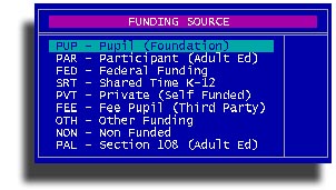 Section 107 Funding comes next. All youngsters under 20 without a diploma are considered Pupils for funding purposes unless they are Shared-Time (which is really a sub-set of pupil). Adults who receive state aid are Participants. Private funding is tuition students. Enrichment students may be either FEE or NON. Only PAL is PAL. If you select SRT, you must also pick K12 in the category panel.