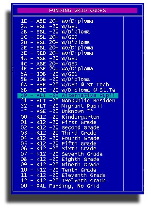 Now you are ready for Grid Code. This is strictly an FTE only type code, let STUREC(c) handle this, he's never wrong. Alternative pupils are always grid code 29 unless they are non-public non-residents, then use 31. Only use 32 Migrant Pupil if you are truly running a special Migrant program. Shared-Time students must be reported in their grade level.