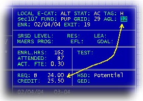 Transfer one class to another by pressing the </> slash. Use this cautiously. Use of the transfer is only appropriate during count week. Normally you should use drop and add. Transfers are not appropriate for learning labs or ABE / ESL classes. Their only appropriate use is in providing a thread of continuity for high school credit classes. Transfers are only appropriate between like classes. For example a literature class to another literature class or a history class to another history. Transfers are not appropriate between a math class and underwater basketweaving! This process has two parts. First you identify the class the student wants to transfer out of and supply an appropriate date, immediately you will asked for the class to transfer into. Make sure you have the correct class code and that the class is properly setup otherwise the transfer will be broken.