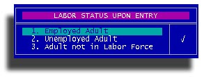 Everyone must have a Labor status. You may simply press the letter L to access this validation panel. Move the pointer and press Enter or just press the appropriate item number. All the items work this way.