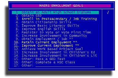 Some goal combinations are no-brainers. Some goals are program enrollment specific. For example, a student enrolled as a high school diploma student (HSD) should have a goal of Obtain an adult High School Diploma, or an employment related goal. Registered GED students should have a goal of Obtain GED. ABE or ESL students should have Improve basic literacy or English skills as their goal. Employment related goals are always an appropriate alternative. For a complete discussion of goal selection please consult the people who run MAERS.