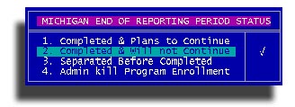 If you simply made a human error and want to start over with a program enrollment, you may select 4.Admin kill program enrollment and it will be erased from the face of the earth. However, this last option 4.Admin kill Program Enrollment should be approached with caution. If your district is a batch participant and the student in consideration has already been "batched" you should not use Admin Kill because it will create an unclosed record in the state MAERS system and will be "Soft Exited" at the end of the year. Oh, dear! If you do not batch or the record has not been previously batched you may use Admin Kill. If the record has already been batched once, you should use 1.Completed and plans to continue then create a new program record with the appropriate data.