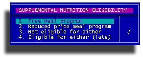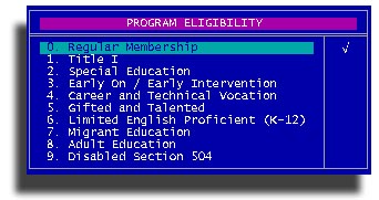 Program eligibility This one you have to do on everybody. Youngsters, anyone under 20 without a diploma, (including Shared-Time) should be checked as Regular Membership. All adult participants should be coded as 8. Adult Education. If you check anything other than Regular Membership or Adult Ed, you will be asked for further details. Ask your boss.