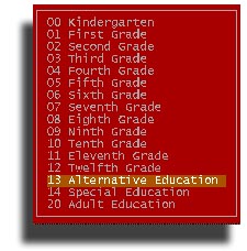 grade Level or setting. You probably deal mostly with adults who are coded "20" and alternative students who may be coded as "13" or the actual grade level. Please consult the people who run SRSD for current definition of these terms and to determine if your school district should be reporting youngsters as 13 Alternative or by their actual grade level. It has something to do with MEAP. You decide. Here are your choices. If you are running a Shared-Time program, use the actual grade level.