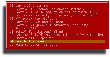 residency Status A code from this list. Shared-Time students must be coded with either 04 if out of district or 08 if in district. You will notice that those two codes are not in this list. That's because STUREC(c) already know this student is not a Shared-Time pupil. If you are not sure, ask your boss or use 06 All other non-resident or 14 Resident student as defaults.