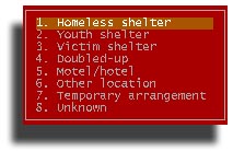 Homeless status Here is a no-brainer. If you know that the student is homeless, answer yes then select the residence / shelter type that applies. A note of caution. You may have an address for a homeless pupil, but you must leave the address empty for a homeless adult. It is a MAERS thing. Go figure.