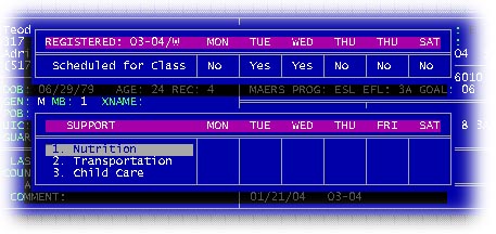 The top panel will show you the days that the student is scheduled for classes. In the bottom panel you may record appropriate support levels. Reports of this data can be found on Menu:6.1.Support Listings.