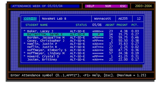 Enter the Course Code and Section Number for the class and it will be displayed on the screen in the same order as on the teacher's input sheet. In this example we selected an individual date so only the position on the grid representing that date is available for data entry. The plus signs represent days that the student is scheduled to meet the class. Equal signs represent days either the student or the class is not scheduled to meet. At the bottom in the message box will be information about allowable attendance symbols and maximum class time. The symbol "P" always represents the maximum scheduled class time.