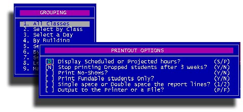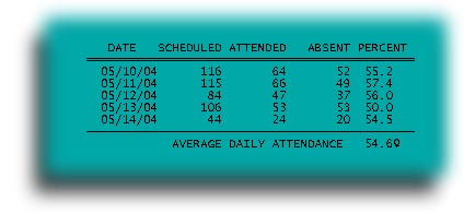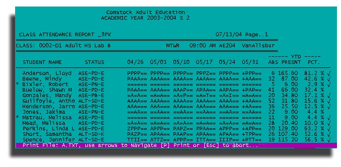 This report will print each class in your selection criteria and list each student along with their attendance record for 25 calendar weeks, along with hours and percentages. This report requires the WIDE 15" paper, it cannot be printed on regular 8 1/2" x 11" paper. You may, however, print to a file and view it on-screen or print to a file then open it an format it in a word processing tool such as Microsoft Word or WordPerfect. This is a class-wise report selected from these groups.