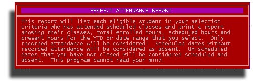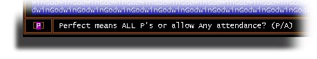 Does Perfect mean all P's or allow any attendance? If you answer "P" then STUREC(c) will look for classes in which all of the attendance marks are the letter "P". Answering "A" means that any positive attendance will be allowed, a class that has an excused or un-excused absence will be disallowed, but a class with a number such as 1 hour or 2 hours will be accepted.