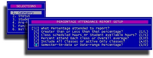 3. Percentage Attendance. This report will look at each student in your selection criteria who has scheduled classes. You may choose a percentage to "Hit" on, whether to use the class schedule or the student's personal schedule, to be Greater than or Less than the percentage you supply. You may choose to check by individual class or overall classes. You may include or not-include early completed classes and you can choose the the enrollment period to date or select a specific date range. The report will contain the student's name and enrollment status, each class, scheduled hours, attended hours and the attended percentage. Don't forget to select a target group