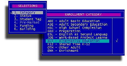 If your program participates in the district's "Average Daily Attendance" calculations, you need this! You may select either an individual date or a date range to examine. You will be offered these groups, but you should choose Category and Alternative only