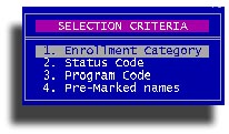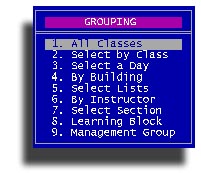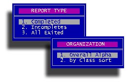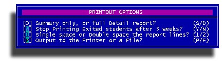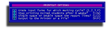 Use this option to print forms for your teachers to gather academic grades and completion of all classes. You will be asked for the enrollment period the the familiar class grouping sub-menu.
