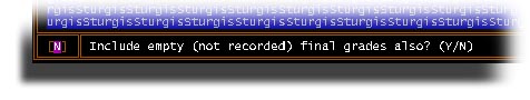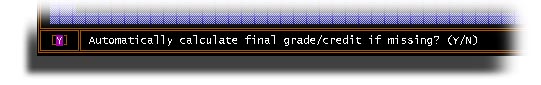 If you answer Yes to this question, STUREC(c) will pre-calculate the final grade and credit based on any Interim grades and credit that may have been entered. If you agree with the suggestion, simply press the Enter key. If you want to modify the final grade, go ahead and type over with the correct final grade and credit. Just a little something to make your job easier.