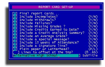 Notice that in a lot of situations where you are setting up reports or some other procedure, some questions will depend upon the answers you gave to earlier questions. For instance here, if you answer that you want a Final grade report, you will be asked if you want to include Interim grades. If you are doing Final grades then the default for Include Credit analysis is set to Yes otherwise set to no on Interim reports. If you answer that you want to print on Plain paper you will not be asked how many lines to offset from the top of your letterhead paper.