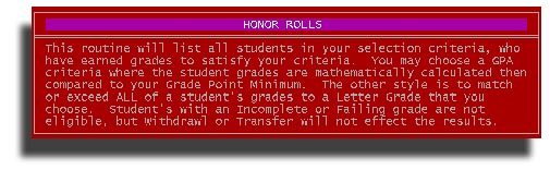 If you select Letter Grade, you can enter the letter grade which will be the lowest grade allowed on the Honor Roll. In other words, all grades must be equal to or better than the grade you put in. Plusses and Minuses are ignored. Then you can make your local selections of student group, as above.