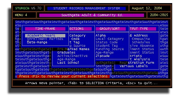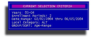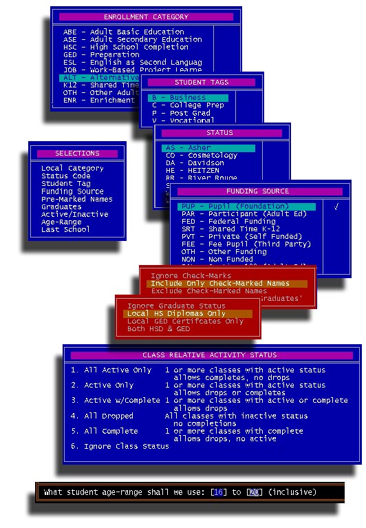 Here is what you will see when you first enter Menu 4. Lots of selections to let you create custom reports from your student database. First you need to select one or more Academic Years. You must choose one academic year before you can choose an enrollment period. If you choose more than one academic year, you will not be able to also check an individual enrollment period. Be sure to read the instructions in the message box at the bottom of the screen for guidance on each step of the process.