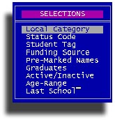 As in other situations in STUREC(c), choices you make in previous selections may affect the choices available later. Here for instance, if you had not chosen an enrollment periods, then concepts related to enrollment periods, such as Funding Source, would no be available. You may choose none to several items from the selections in this list. Every time you choose something, you limit the scope of your report. Here is a look at all the options available from the Selections panel.