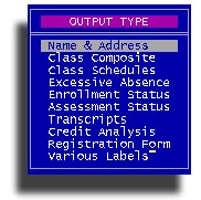 Press the Tab key again to move to the Output Type menu. You may continue to make selections and print reports in this menu as long as needed.