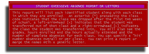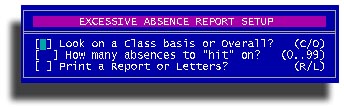 If you choose to look on a Class basis, the number of absences to "hit" on will be applied to each individual class, if choose Overall, then the hit number will be applied to all classes as a group. Output as a Report will give you a report similar to class composite, but with the benefit of the selection process based on number of absences. If you select Letter as your report style, you will be shown a list of available generic letters or you may create a new letter.