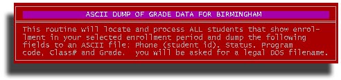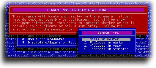 You will be asked if you would like a printed report of the duplicate names. Answer Yes, then you can use the list to find each name and decide what, if anything, you need to enter from one record into the other. You should only have one master record for any individual student. And no, STUREC(c) cannot automatically make one good record out of two or three dupes.
