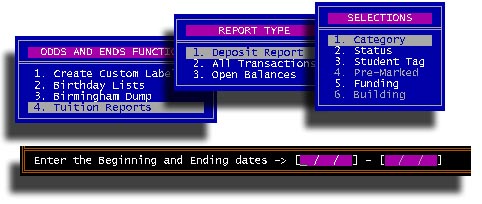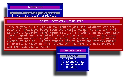 This option will allow you to search for potential "duplicates" in your database. You can search for possible duplicate names in the student master, or you may search for possible duplicate "FidCodes". What's a FidCode? It is the internal number assigned to each new student master record. If your local system is configured and working properly, duplicate FidCodes should never happen, but alas, sometimes your system is not configured properly and this may allow your workstation to run out of local memory. If this happens, STURE(c) may get confused and issue a duplicate FidCode. The three most likely files for this to happen in are the Student Master, Student academic Year file and the Student Semester file. If you suspect you may have some kind of "dupe" problem, be sure you have a fresh current backup before you try any of these.