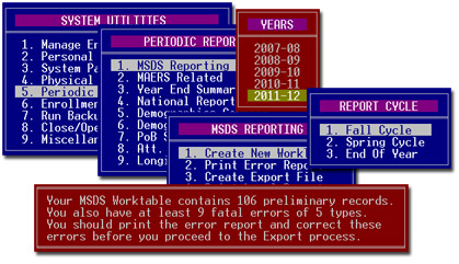 MSDS: General Review for any Reporting CycleHere are the easy steps to success for any reporting period. Remember, we report MSDS data after the Fall Count Date, after the Spring Count Date and at the End of the Year. We are using Fall in our examples, but the process is essentially the same for any reporting cycle. MSDS is the acronym for Michigan Student Data System. This replaces the SRSD we have had in the past. All along during you normal registration activities, you have been entering the MSDS specific data via the MSDS Review panel, right?