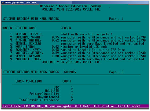 The file created will be named something like X8080160_FAL2011.xml where the first letter is always "X" followed by your ISD code then followed by your LEA code and the name of the reporting period and has the extension of .xml. This file will be found in the Export folder inside of your Sturec default directory (folder). This file conforms to all current CEPI definitions and passes the current schema. And finally, for your peace of mind Wow, how easy is this? Remember, for the End of Year or final reporting cycle for the year, you have to account for students who were counted in either the Fall or Spring cycle and were not reported as dropped, graduated or otherwise exited in the Spring cycle. If a student was not counted for FTE in any count period, they will not be included in this file unless they have an exit code and date. Conversely, any student counted in any count period must be included here and must have an appropriate Status Upon Exit code and date. Here are some of the errors that STUREC© checks for...